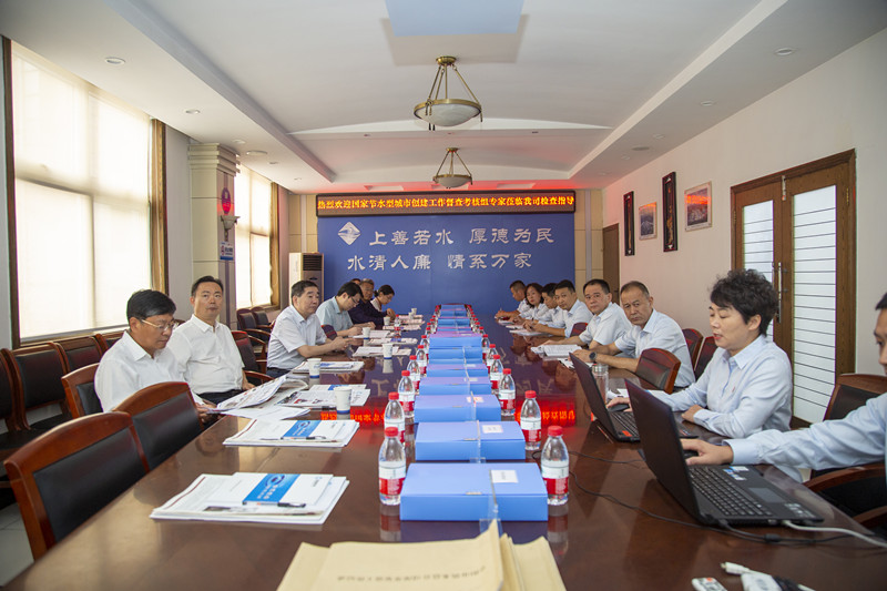 在会议室,总公司党委副书记、副总经理闫献华就制水生产处理工艺、水质检测、阶梯式水价执行、特种用水收费、DMA分区计量管理、创建成效、创建计划等节水工作开展情况,向考核组进行了汇报。总公司党委书记、总经理张传峰简要汇报了总公司在创建节水型城市过程中,以提高水资源利用效率为核心,推进城市生活节水管理和水资源综合利用,扎实有效地推动了高质量节水型企业建设。